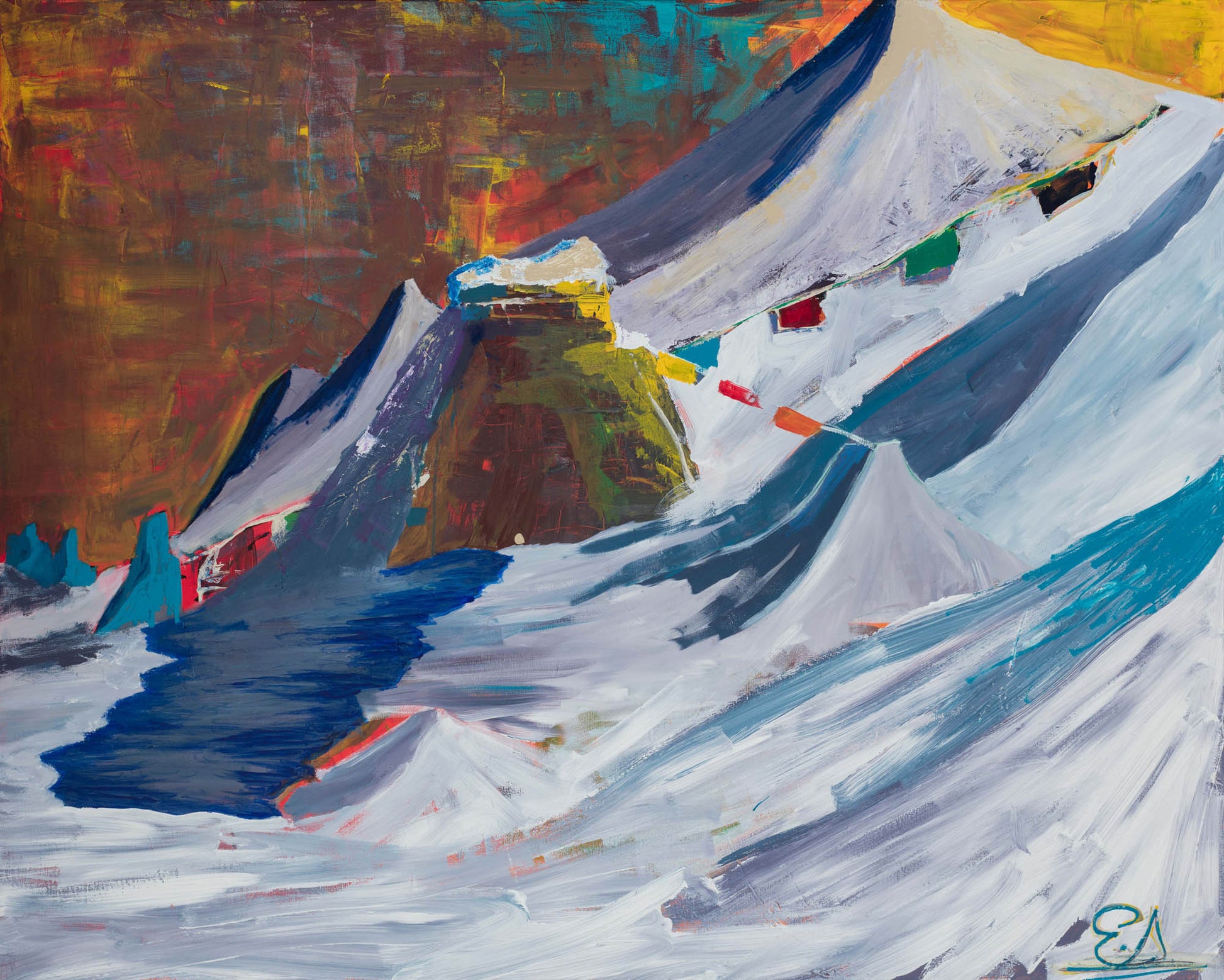 This was another mountain painting that I created after skiing in Zermatt. What struck me when I was skiing in the Alps was how close to the edge of cliffs you are allowed to ski in Europe, and how there is only a small rope that separates you from carving a perfect turn to going over the edge and falling into a cravass. I also started thinking about how brave some people are, whether they are athletes or going through something very difficult in their lives. The central theme of this painting is the importance spirituality in our lives. Because of this, I placed a series of prayer flags which is a practice done to show support for climbers who plan to ascend Everest. I also thought a lot about people who have chronic illnesses, including cancer, and how brave some children even are when they are receiving chemotherapy. This was my way of saluting them and "saying a prayer for the brave." In terms of the technical parts of the painting, I used a mix of bright and muted tones to depict the sky to convey the ups and downs of life, and the peaks and valleys of the mountains also demonstrate this concept.