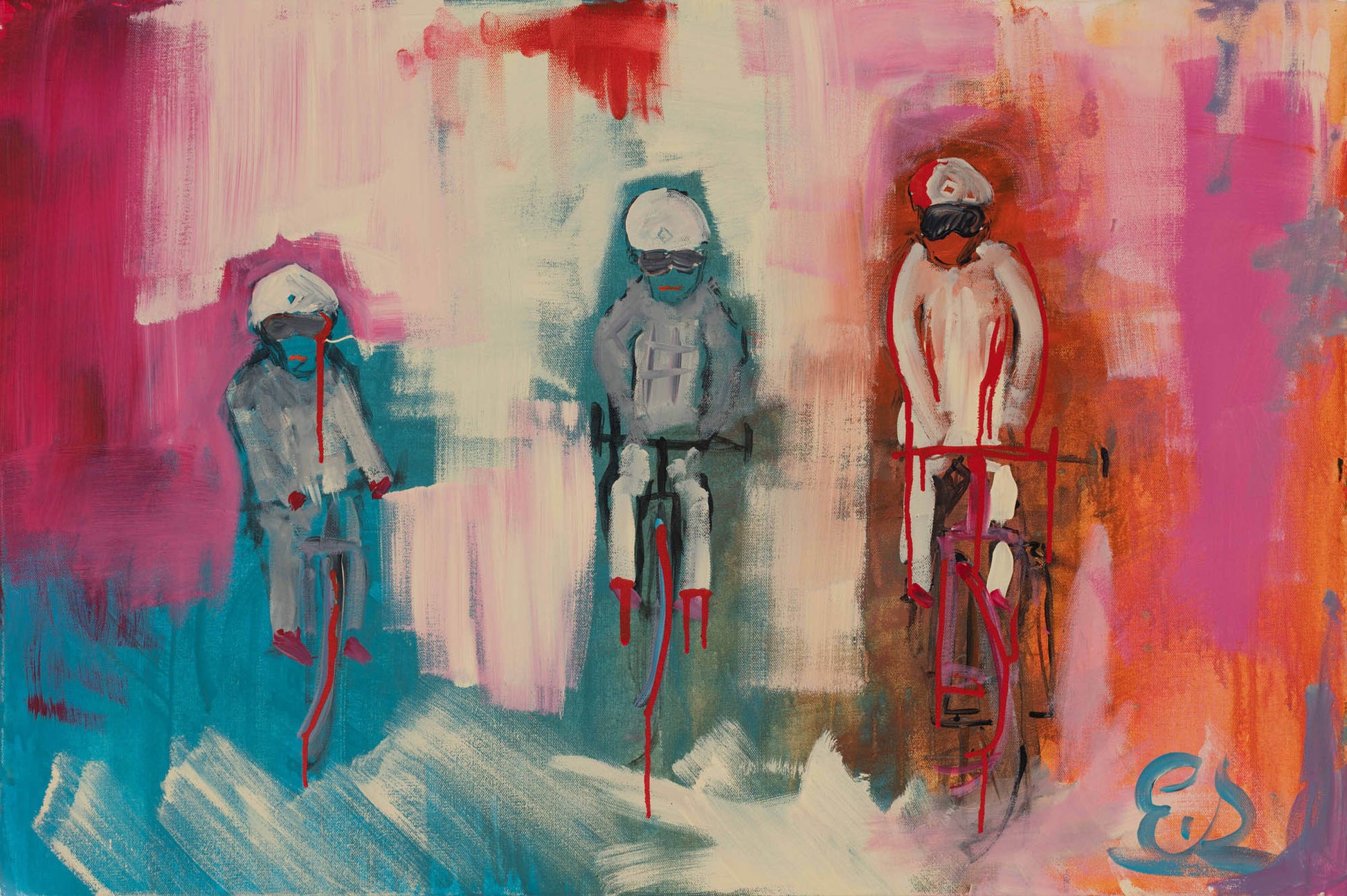 In this commissioned piece, I painted a picture of my ski coach’s girlfriend who is on the national cycling team. I really enjoyed creating this painting and wanted to combine the concept of the amount of time and dedication it takes to become an elite athelite. Because it takes a lot of “blood, sweat and tears” to make it onto the podium of any sport, I used the colour red to depict the tires and the jerseys of the cyclists.