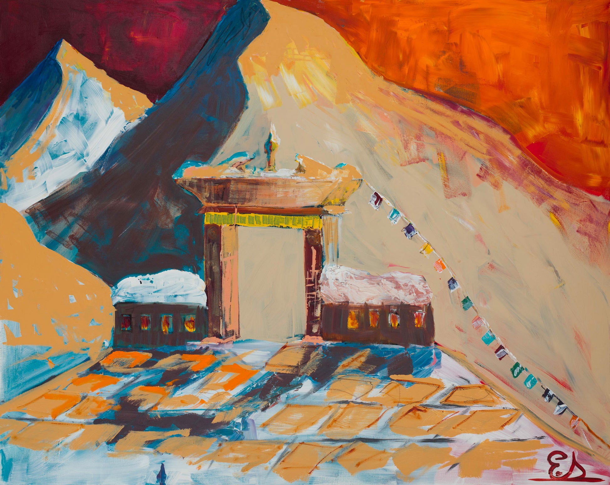 Mountains are something that I love. I started skiing when I was 2 and successfully skied The Cliff at Big White in BC at the age of 5. I have also been lucky enough to have skied in the Alps. In this painting, I wanted to show both the potential for great adventure but also the risk of mountains. I chose bright orange to depict the sunny side of the mountain and a more dark hue to represent the mountain’s more sinister side. To me mountains, and the outdoors in general, represent a spiritual experience. Because of this, I also added prayer flags to embrace this concept. The last thing that I placed in the painting was a gateway in the centre of the canvas. This was important because for me it represents a lot of things. For instance it represents the difference between standing and looking at the mountain from a far – but not really entering it due to fear of the unknown. I think that we all have a choice of whether we stay on the safe road (shown with the tiles) or enter into the vastness of the unknown. Lastly, the gateway also represents the transition from the real world into the spiritual world – the Gateway to Nirvana.