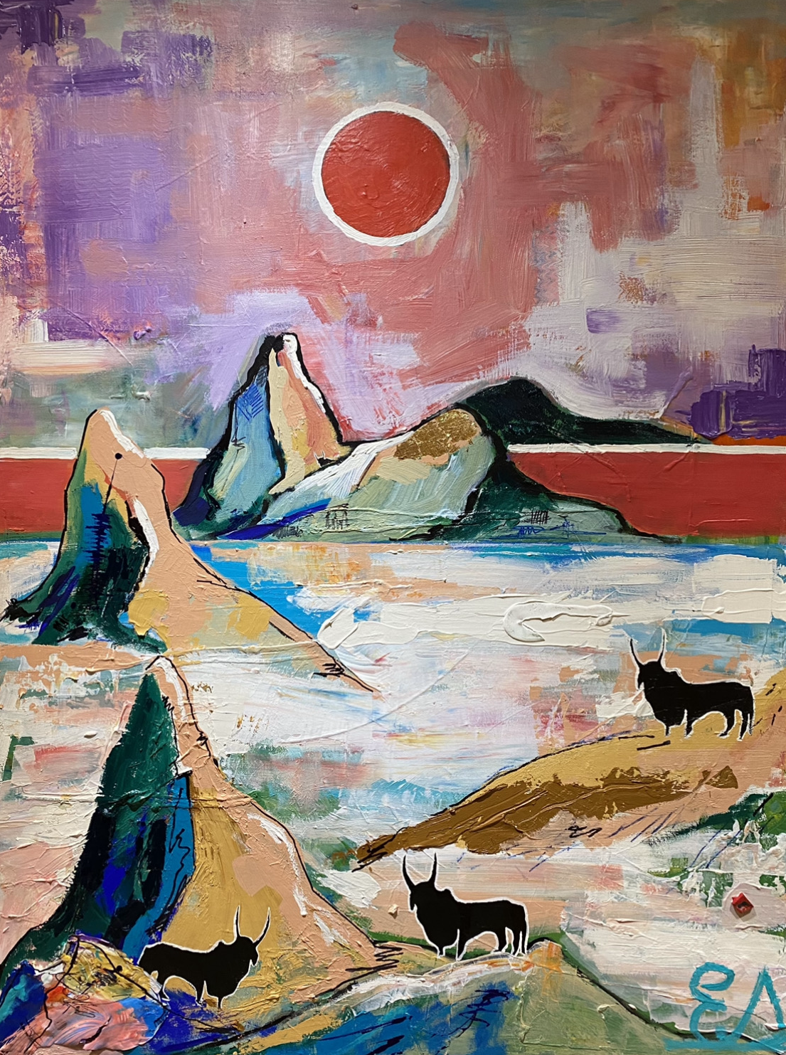 For many in the East, a line represents the transition between the physical world to the spiritual realm. Sharma’s crimson horizon draws the viewer's attention to that separation while also symbolizing the effect that methane and carbon emissions are having on our environment. By marking this band as a focal point of the painting, Sharma hopes to engage the viewer in questioning whether this line can ever be broken? Essentially, can we, as a species, move forward?