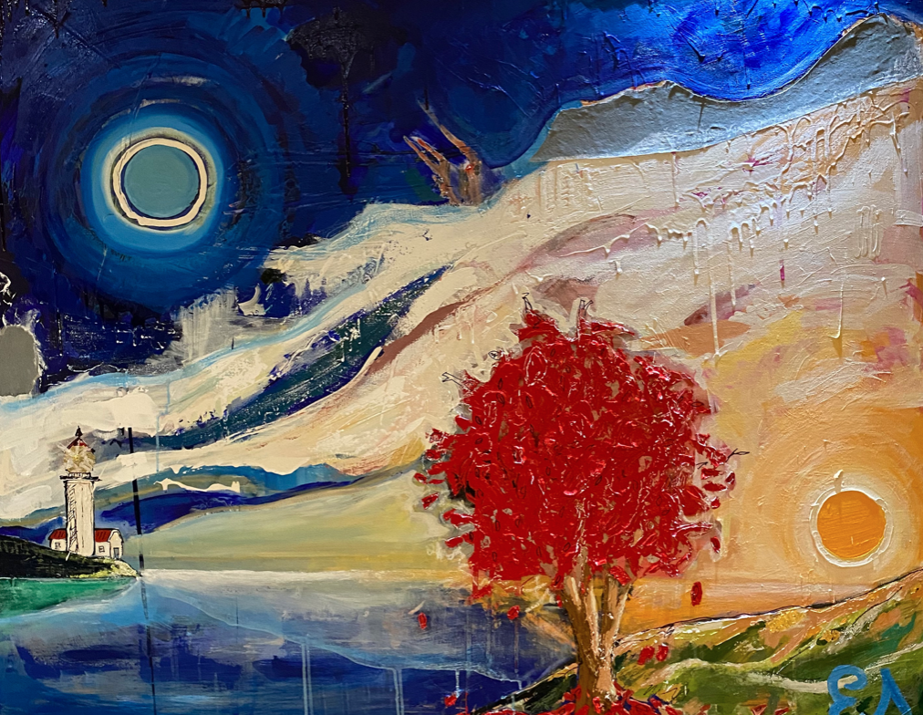 With this last concept, I decided to add rings around the sun and the moon, to open the piece to a broader interpretation, leaving the viewer to wonder which planet the red maple is inhabiting.
