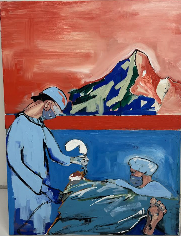 As Patient x is now firmly diagnosed with Cruetzfeld-Jacob Disease, he is desperate to live even one additional day; he opts for experimental surgery. This is the painting in the series where we first see the patient in flesh and blood instead of seeing his silhouette only. In the operating room, we see both the anesthetist bagging the patient as the surgeon works late into the evening, her eyes intently fixated on a small cranial hole. As Patient x fades in and out of consciousness, he is taken to a distant world - his Valhalla - where lava freely flows. The red horizontal stripe firmly defines the line between the present and spiritual worlds. Here, too, I have chosen to use blues and reds as the predominant colours to highlight the narrative: the upper half provides Patient x’s hope, but the blues of the doctor’s scrubs provide coolness rooted in reality.