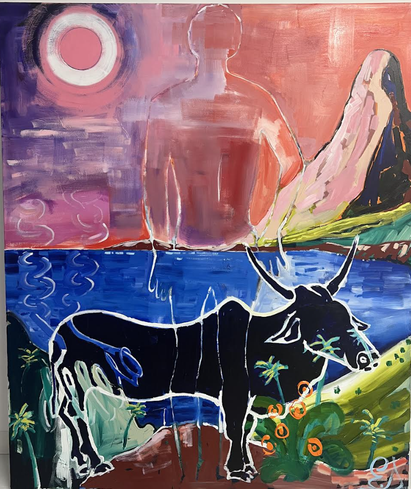 While the surfer's silhouette is present in this work, his visage and details are not. This was done because, in reality, each of us could be in his position. Furthermore, I wanted to paint from the surfer's perspective and show the beauty of what he sees; he is surveying the wind and waves and deciding whether to surf or go hiking today. Overtly, it is just another day in a carefree life. Unbeknownst to him, however, his body is now an incubator for prion growth – represented by the helicoid structures on the left of the painting. The putative reservoir of the prion is believed to be a contaminated cow in the foreground. In the distance is a Matterhorn-like mountain, hinting at the health challenges that will soon become his reality.