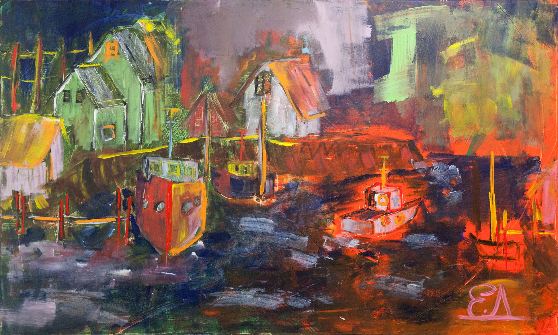 I really enjoyed creating this painting of Peggy’s Cove. Historically, light houses remind me of a time when navigation was the dominant form of travel. I used to spend summers visiting the Maritimes and loved visiting the rugged coastline seeing the power of the waves and smelling the saltiness of the air. I also spent time in Sagres in the most Western tip of Portugal and this painting represents feelings that I had while visiting both these places. In particular because Nova Scotia and Portugal represent the boundaries of the Altantic ocean, I was thinking about what it would be like to leave the safety of land and enter into the great unknown, if sailing from either port. I also painted the concept of the Northern Lights on the right of the painting to highlight the optimistic dreamer’s mentality that many sailors must have to leave safety and security.