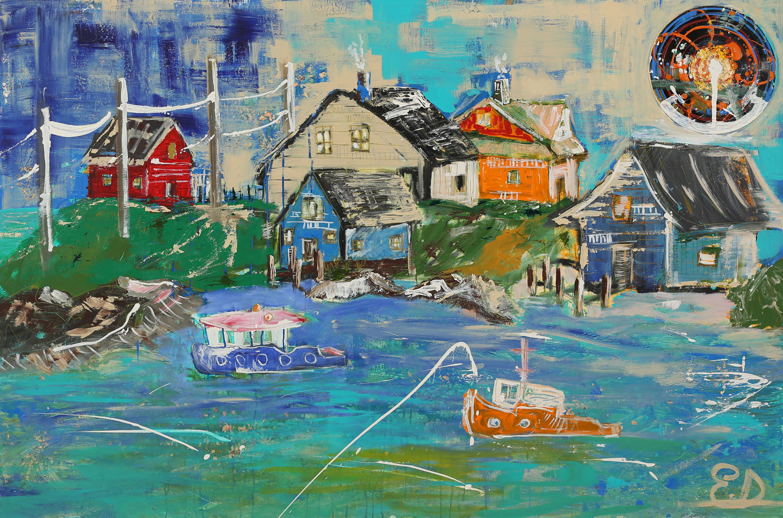 The Last Cast is a painting of a small harbor in the Maritimes provinces. One of the most interesting parts for me to create was the “sun,” which appears in the upper right of the painting. This was actually a spin painting that I made using an old-fashioned record player and a vintage vinyl record. The sun also has been enhanced with some gold foil. The central part of the painting is a line that has been cast into the water. I wanted people who are looking at the painting to feel that they are experiencing the joy fishing at the same time as those who are on the boats in the picture. To get this feeling, I actually “cast the paint” and had it land on the canvas, much in the way that a hook lands in the water. So the line is actually being cast from outside the painting, giving the painting more of an “action” feel to it. Because the painting was done over Christmas, the painting was also inspired by the Biblical concept of the Miraculous Draught of Fish. By giving the feeling that the line was coming from outside the painting, I also wanted to convey the idea of spirituality and that there is always something outside of our own world influencing it.