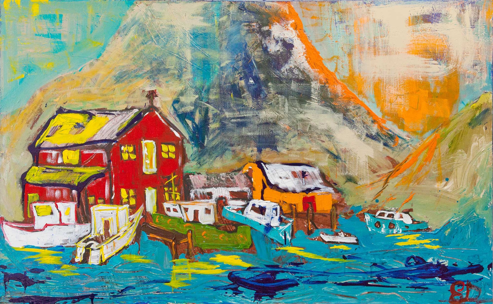 I created this painting after being out on the water for most of the day in Lake Ontario. When we started the waters were calm, but once out, a storm quickly rolled in and we were hit with hail pellets and 5 foot waves. It was the first day I was the Captain during a storm. When I sat down to paint this, I was thinking of what it would be like to be a captain of a fishing boat in Nova Scotia and how quickly the weather can turn on the water. The potential of a storm is shown in both the haziness of the clouds over the orange sky and the darkness of part of the mountain. As an avid sailor and angler, an orange sky in a storm is always concerning as it might mean a severe electrical storm or tornado is soon to hit. It also conveys the idea that despite the beauty of the water, there is always risk to it. This painting was created for the Fare for Friends auction to raise funds for the United Way.