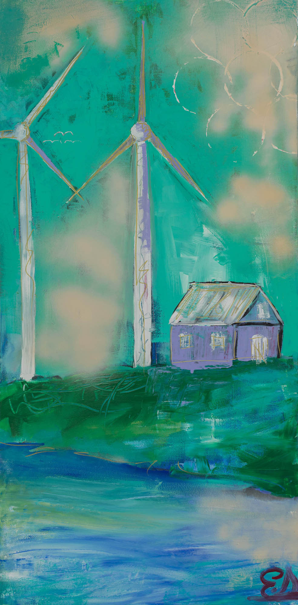 In the summers, I spend a lot of time sailing in Lake Ontario. One of the spectacular scenes is seeing the windmills on Wolfe Island which help provide energy to our electrical grid. I created this painting after seeing one of these towers up close. I placed the house very near to the windmills to think of the controversy that exists between the people who live on the island and the companies that are placing them there. I also put circles on the upper right of the painting to signify the importance of technology and scientific advancement to man. Lastly, I also put in some clouds in the painting to signify that windmills are moving us forward into an era that makes us less reliant on carbon energy.